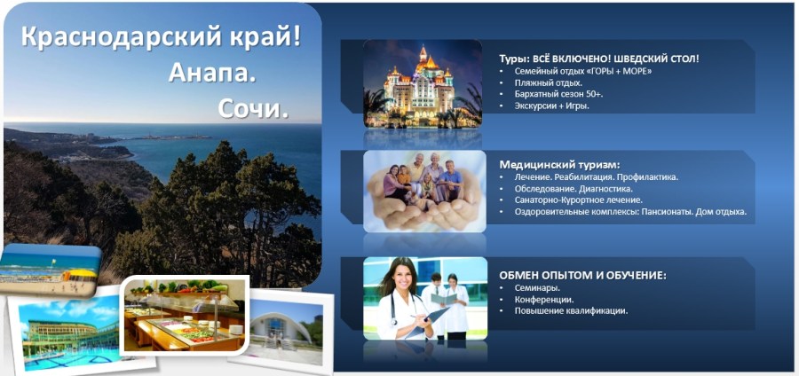 У нас сейчас самые популярные санаторно-курортные направления – это Краснодарский край и Республика Крым. Это «и житница, и кузница, и здравница» — так гласит известная цитата из полюбившегося советского кино. В эпоху СССР все мечтали приобрести путевки в эти благодатные места даже в межсезонье. Климат великолепный, все доступно, а сколько достопримечательностей в этих регионах!