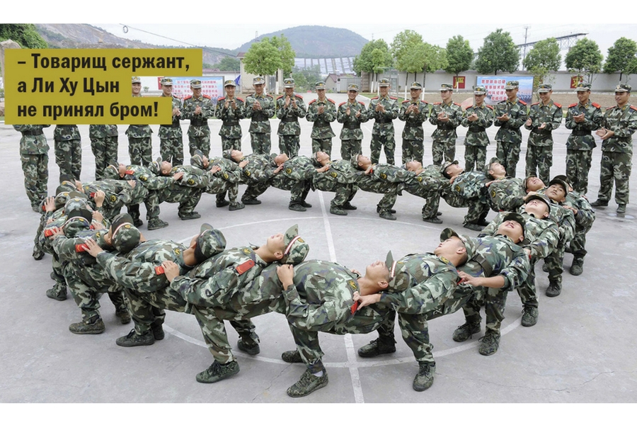 Это фото из Китая. На нем — доблестные потомки терракотовой армии, которые демонстрируют психологический тренинг в виде армейского тимбилдинга. Замысловатая фигура выглядит довольно необычно: раньше такой «хоровод» только спартанцы могли себе позволить. Потрясающая гибкость и чувство «локтя»!