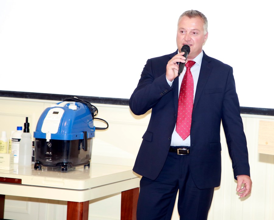 «Спасибо вам за гостеприимство. Компания Maxima была основана в 1997 году, а ее продукция всецело направлена на сохранение экологии. Сейчас компания сотрудничает с тридцатью тремя странами, и я надеюсь, что бизнесмены Кыргызстана пополнят ряды наших партнеров. Пылесос «Гера плюс», возможности которого я сейчас продемонстрирую, использует мощь воды для очистки даже самых сильных загрязнений», — рассказал Джузеппе Кодемо.