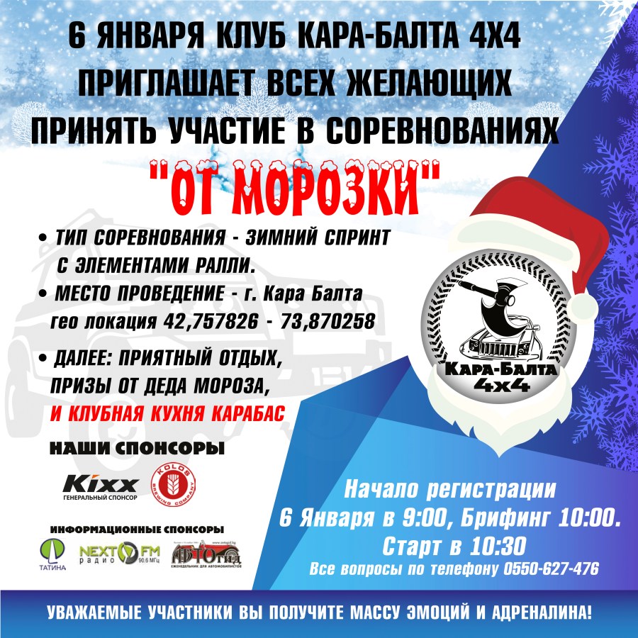 Дорогие друзья! Внедорожный клуб «Кара-Балта 4×4» приглашает всех желающих посетить соревнования по зимнему спринту с элементами ралли «От Морозки».
